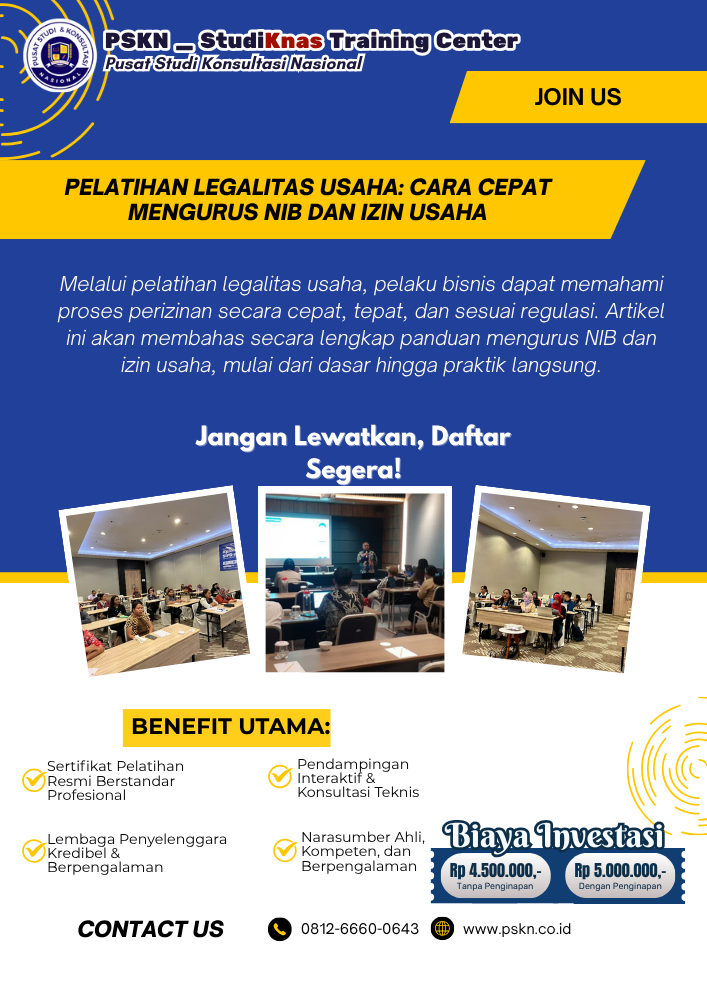 Legalitas usaha merupakan fondasi utama dalam menjalankan bisnis yang aman, profesional, dan berkelanjutan. Di Indonesia, proses perizinan kini semakin mudah dengan hadirnya sistem Online Single Submission (OSS). Namun, masih banyak pelaku usaha yang belum memahami cara mengurus Nomor Induk Berusaha (NIB) dan izin usaha secara benar. Melalui pelatihan legalitas usaha, pelaku bisnis dapat memahami proses perizinan secara cepat, tepat, dan sesuai regulasi. Artikel ini akan membahas secara lengkap panduan mengurus NIB dan izin usaha, mulai dari dasar hingga praktik langsung. Untuk pemahaman menyeluruh terkait pelatihan, konsultasi, dan pendampingan bisnis, baca juga artikel berikut:👉 I