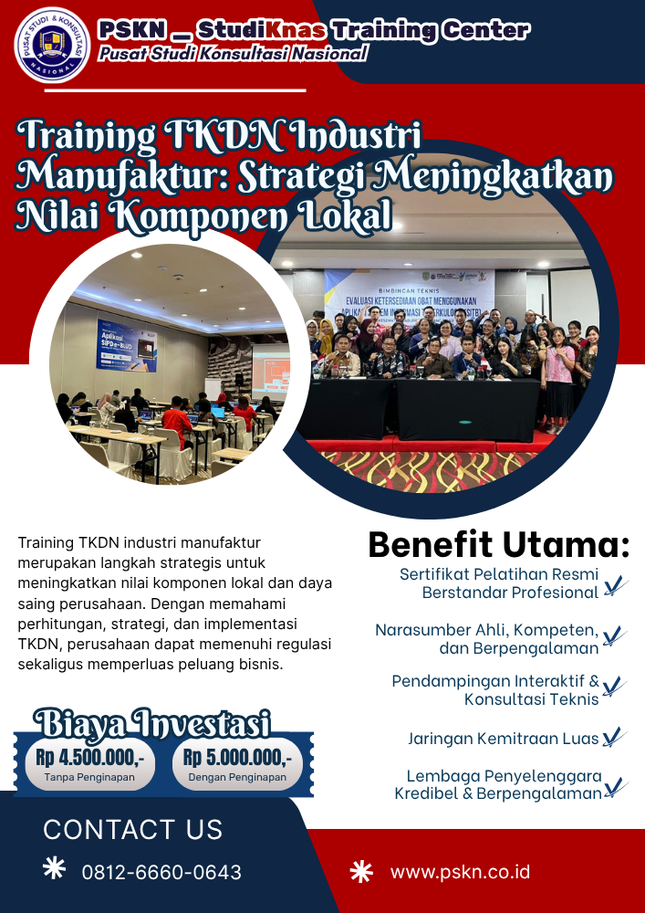 Dalam era industrialisasi modern, perusahaan manufaktur di Indonesia dihadapkan pada tuntutan untuk meningkatkan daya saing sekaligus memenuhi regulasi pemerintah. Salah satu aspek penting yang menjadi perhatian adalah Tingkat Komponen Dalam Negeri (TKDN), yang berperan besar dalam pengadaan barang/jasa, khususnya proyek pemerintah. Melalui training TKDN industri manufaktur, perusahaan dapat memahami strategi efektif dalam meningkatkan nilai komponen lokal. Hal ini tidak hanya berdampak pada kepatuhan regulasi, tetapi juga membuka peluang bisnis yang lebih luas. Untuk memahami konsep pelatihan, konsultasi, dan pendampingan secara menyeluruh, baca juga artikel berikut:👉