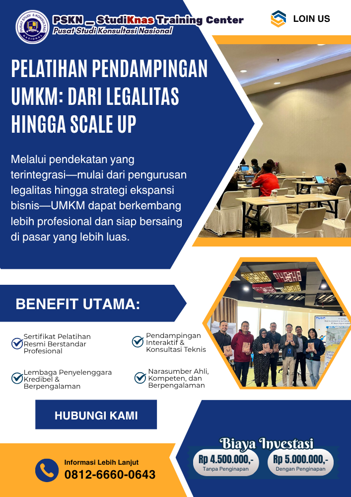 Usaha Mikro, Kecil, dan Menengah (UMKM) merupakan tulang punggung perekonomian Indonesia. Namun, banyak UMKM menghadapi berbagai tantangan, mulai dari legalitas usaha hingga kesulitan dalam mengembangkan bisnis (scale up). Oleh karena itu, pelatihan dan pendampingan UMKM menjadi solusi strategis untuk meningkatkan daya saing dan pertumbuhan usaha secara berkelanjutan. Melalui pendekatan yang terintegrasi—mulai dari pengurusan legalitas hingga strategi ekspansi bisnis—UMKM dapat berkembang lebih profesional dan siap bersaing di pasar yang lebih luas. Untuk pemahaman lebih komprehensif, baca juga artikel berikut:👉 Info Pelatihan, Konsultasi, dan Pendampinga...