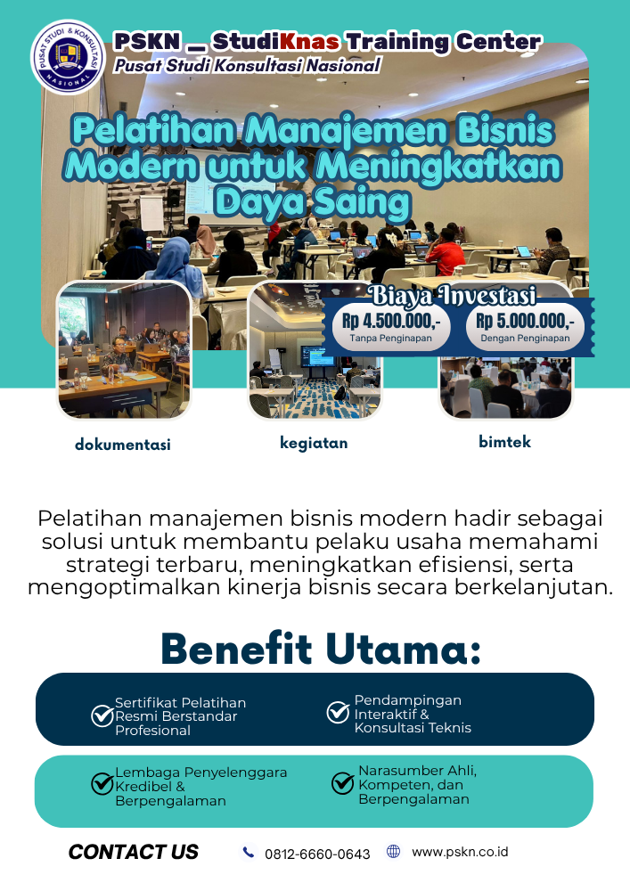 Di tengah perubahan ekonomi global dan perkembangan teknologi yang pesat, pelaku usaha dituntut untuk mampu beradaptasi dengan cepat. Manajemen bisnis modern menjadi kunci utama dalam meningkatkan daya saing perusahaan, baik untuk skala UMKM maupun korporasi besar. Pelatihan manajemen bisnis modern hadir sebagai solusi untuk membantu pelaku usaha memahami strategi terbaru, meningkatkan efisiensi, serta mengoptimalkan kinerja bisnis secara berkelanjutan. Untuk memahami pendekatan pelatihan, konsultasi, dan pendampingan secara menyeluruh, baca juga:👉 Info Pelatihan, Konsultasi, dan Pendampingan TKDN, Legalitas & Bisnis untuk Meningkatkan Daya Saing ...