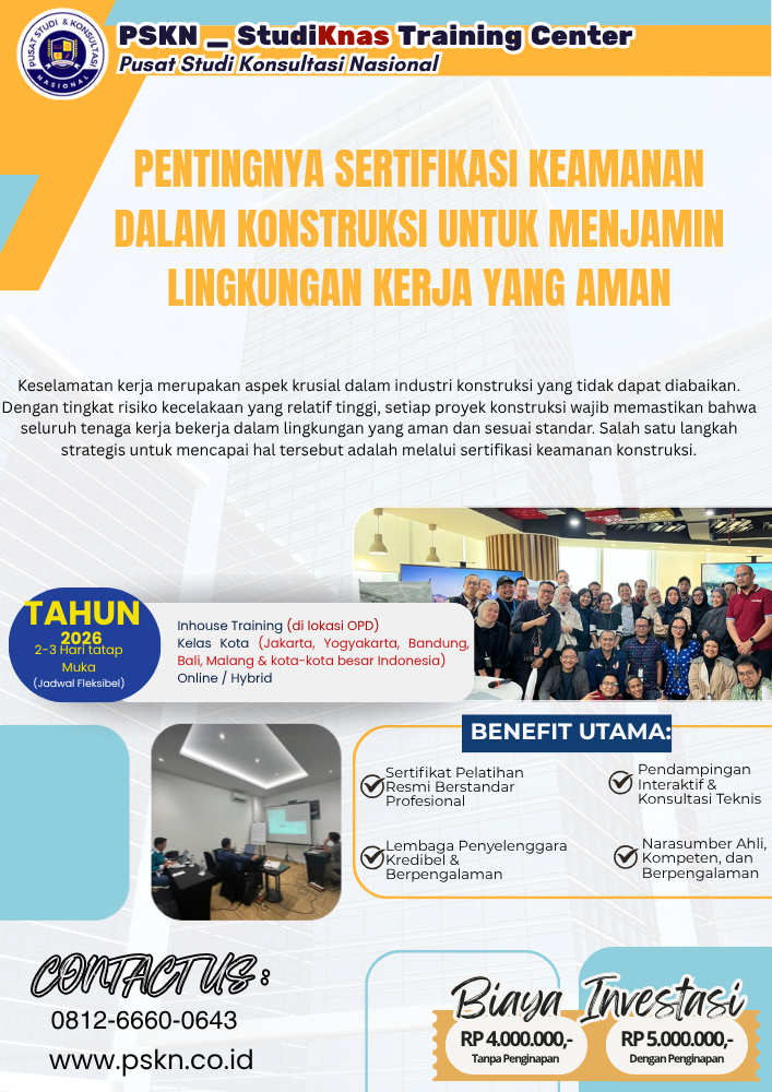 Sertifikasi keamanan konstruksi merupakan langkah penting dalam menciptakan lingkungan kerja yang aman dan profesional. Dengan tenaga kerja yang kompeten dan bersertifikat, risiko kecelakaan dapat ditekan secara signifikan.